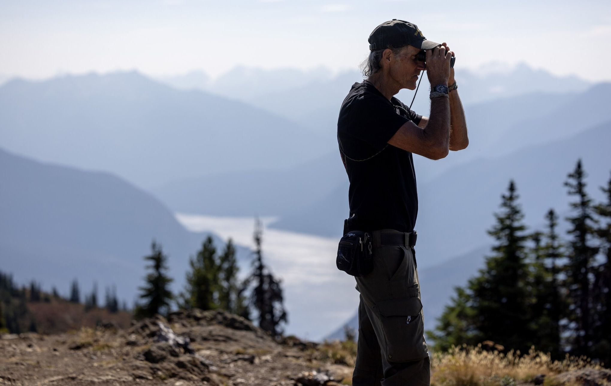 Jim Henterly, a National Park Service fire lookout, uses binoculars to keep an eye on the Perry fire from Desolation Peak on Sept. 13 in North Cascades National Park. (Nick Wagner / The Seattle Times)