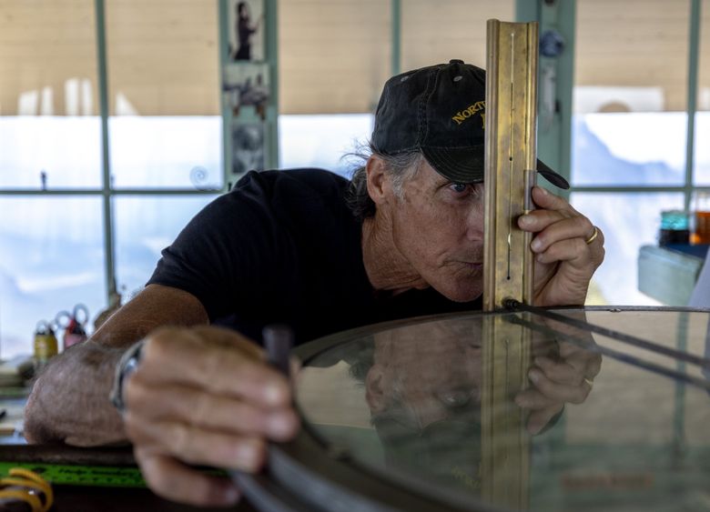 Jim Henterly dials in an Osborne Fire Finder last month from his Desolation Peak lookout. (Nick Wagner / The Seattle Times)