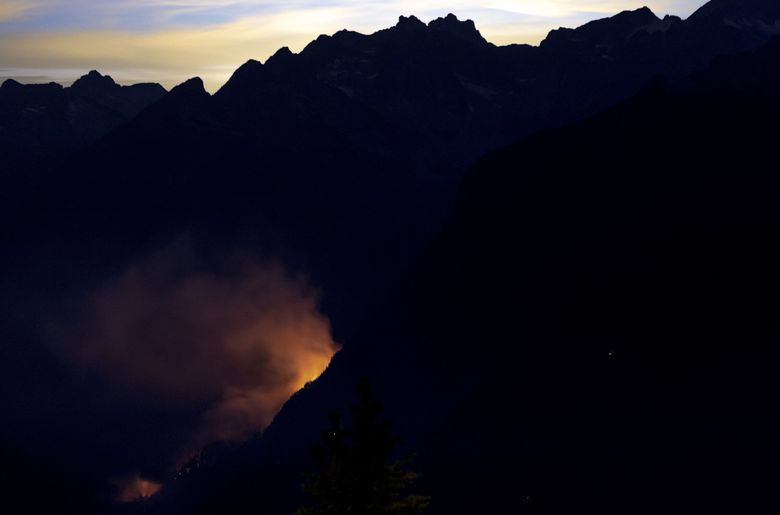 The Perry fire glows orange as the sun sets Sept. 13 in North Cascades National Park. (Nick Wagner / The Seattle Times)