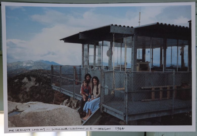 A photo from 1984 shows Jim Henterly with his wife, Ann Marie, and daughter Lael at the Mount Ireland fire lookout in Oregon’s Blue Mountains. (Nick Wagner / The Seattle Times)