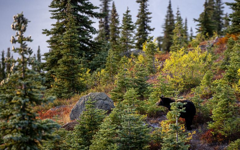 A black bear forages on wild blueberries Sept. 13 in North Cascades National Park. (Nick Wagner / The Seattle Times)