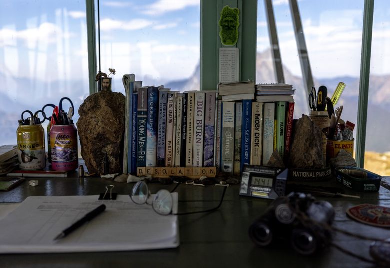 A daily log, books and more tidbits belonging to Jim Henterly sit on a desk inside the Desolation Peak lookout in North Cascades National Park. (Nick Wagner / The Seattle Times)