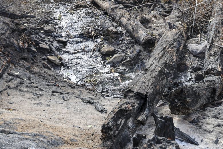 A stream is choked by charred remnants from the Labor Mountain fires near Cle Elum on Oct. 1. (Kevin Clark / The Seattle Times)