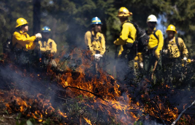 Fire burns through brush during prescribed-burn training in May 2 near Roslyn. (Nick Wagner / The Seattle Times)
