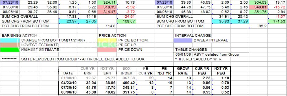 At the bottom of the main table is a second table for the SOX that shows earnings estimates, growth estimates with PEs and PEGs calculated using these numbers at different points in time. This is a quick way to find the compression of the PE and PEG numbers. The last 2 entries in the table will be rolled over each week as we go forward to give an indication each week of the direction of the compression "factor". This week the PEG numbers are still dropping.