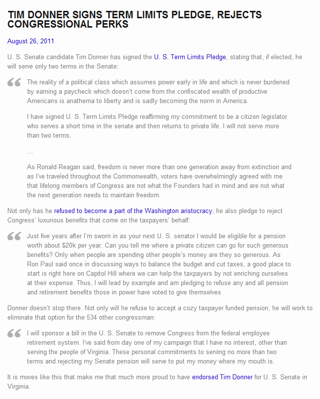 Too bad Tim Donner didn't win the U.S. Senate primary in Virginia. He signed a term limits pledge and also pledged to reject a Senate pension.