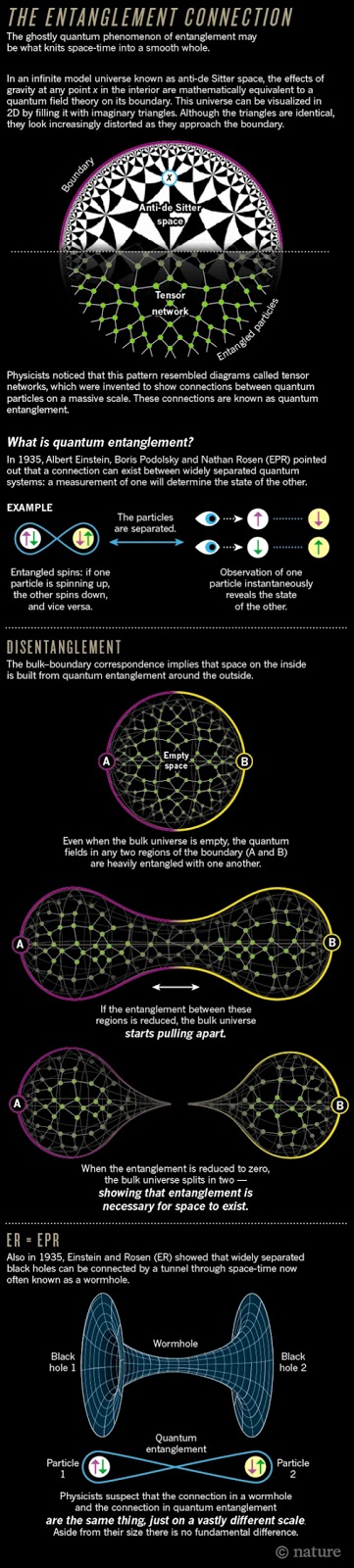 He was able to answer that question using mathematical tools4 introduced in 2006 by Shinsei Ryu, now at the University of Illinois at Urbana–Champaign, and Tadashi Takanagi, now at the Yukawa Institute for Theoretical Physics at Kyoto University in Japan. Their equations allowed him to model a slow and methodical reduction in the boundary field’s entanglement, and to watch the response in the bulk, where he saw space-time steadily elongating and pulling apart (see ‘The entanglement connection’). Ultimately, he found, reducing the entanglement to zero would break the space-time into disjointed chunks, like chewing gum stretched too far.