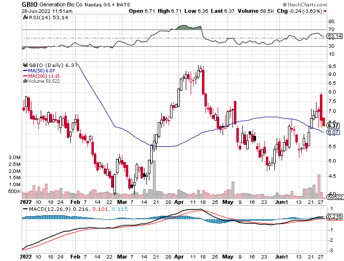6/28/22 - GBIO: $6.40; one of two companies making "the abortion pill." Approved by FDA. Biden Admin. & DOJ in favor of selling through mail. New laws says nothing about contraceptive devices or pills. Target price $22. Analysts: 2 Strong Buys / 3 Buy / 2 Hold. Just filled gap at $6.59. Above 50 DMA: