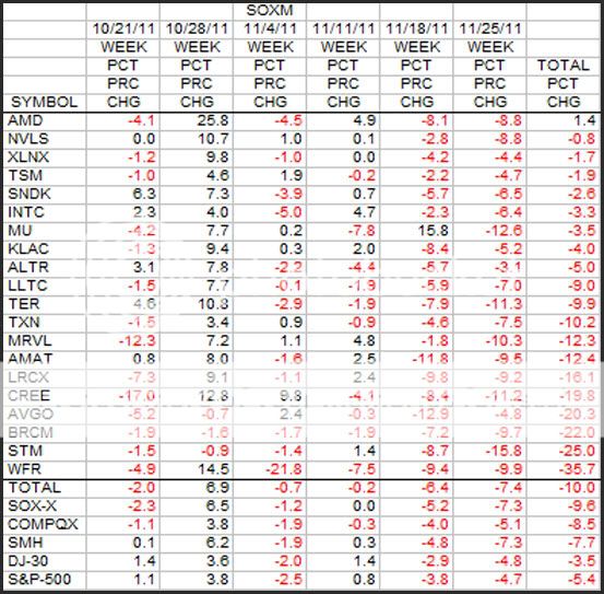 Here AMD in top spot had a 1.4 percent gain while WFR was in the bottom with a 35.7 percent loss. The SOXM is down about 14 percent in the last 2 weeks. The SOX is down over 12 percent for the 2 weeks.