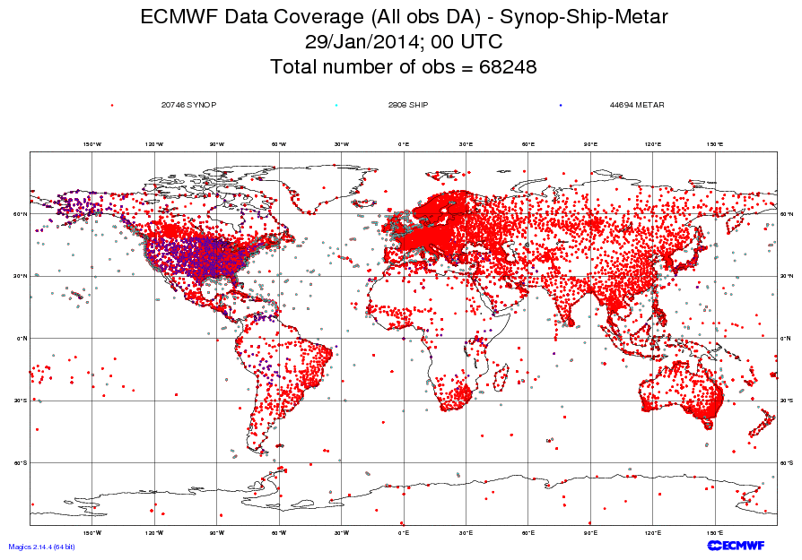 Superstorm Sandy hit the NY Metro area, home of tens of millions of people, with hurricane-force winds and major coastal flooding. Roughly 150 lost their lives and many of them did so because they ignored the forecasts. A similar storm hit a far more sparsely populated area of eastern Long Island in 1938 and over a thousand people perished. In 1900, a hurricane hit Galveston Texas and 6000 people died. Weather prediction is now an essential tool for farmers and for those that manage our dams and roads, to mention only a few applications. And if the weather becomes more extreme under global warming, improved weather prediction will play a large role in protecting life and property. The amount of data collected for operational numerical weather prediction is staggering. Petabytes of weather data are streaming to earth from dozens of weather satellites each day. Hundreds of thousands of surface stations, roughly a thousand radiosondes, thousands of ships and buoys, thousands of aircraft, lightning detection networks, and other sensors are reporting each day, adding up to tens to hundreds terabytes of information daily. All this data is distributed around the world, quality controlled, and used to provide a physically consistent description of the three-dimensional atmosphere.  A NOAA Polar Orbiter Weather Satellite Modern numerical forecasting went from non-existent in 1950 to highly skillful today. The following chart is my favorite. It shows increasing skill at 3, 5, 7, and 10 days at 500 hPa (about 18,000 ft) at one major forecasting center (the European Center, ECMWF). Major increases in skill at each time projection (up is better). But even more impressive is the fact that southern hemisphere forecast skill (the lower lines for each color band) now equals to the northern (which has much surface and upper air observations). The major reason: weather satellites  So during this end-of-year season it is good to reflect on how far we have come in weather prediction, even though we have the potential to push the science and technology much further. And we should not forget the dedicated folks that developed the models, the scientists/engineers that designed the satellites and observing systems, and the human forecasters that interpret and communicate the model output. A huge and expensive enterprise that is worth the investment. And one that has been been a successful partnership between the government and private sectors. The media spends so much time highlighting what is wrong with society. But sometime we should think about our great positive achievements, particularly those dependent on the active positive cooperation of mankind. Weather prediction surely is one of them. Posted by Cliff Mass at 10:04 AM