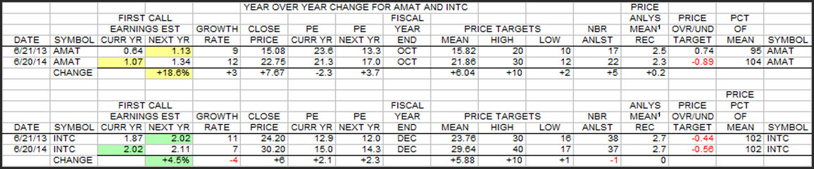 For INTC, an incredible happening has occurred. The Nxt Yr estimate in 2013 was 2.02, and now a year later it is still 2.02, no change. Boy, are those analysts good or what? Now the Nxt Yr number is at 2.11, or a 4.5% increase compared to last year's number. Notice how PEs have increased for both Cur Yr and Nxt Yr compared to the year ago numbers. Price targets have gone up, but remain at 102 percent, the same as last year at this time.