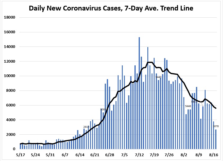 The chart below tracks the daily positive cases and provides a 7-day average trend line based on cases reported by the Florida Department of Health (DOH) through August 17th.