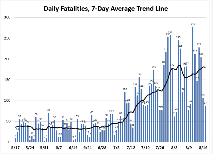 The chart below tracks the daily reported deaths and provides a 7-day average trend line based on cases reported by the Florida Department of Health (DOH) through August 17th.