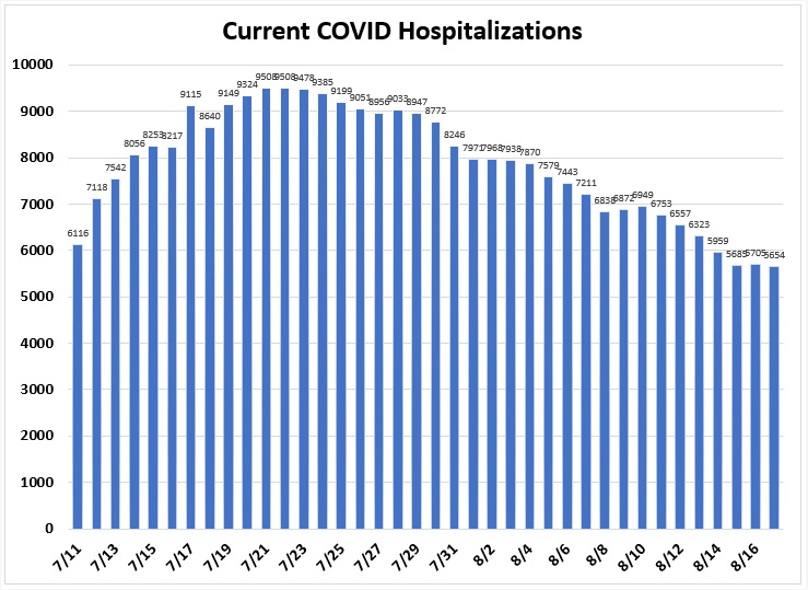 The chart below tracks the daily hospitalizations and provides a 7-day average trend line based on cases reported by the Florida Department of Health (DOH) through August 17th.