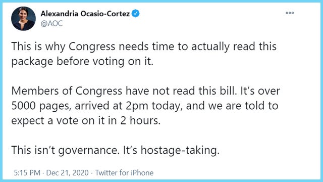 Are you ready? Here comes the tweet. “This is why Congress needs time to actually read this package before voting on it. Members of Congress have not read this bill. It’s over 5000 pages, arrived at 2pm today, and we are told to expect a vote on it in 2 hours. This isn’t governance. It’s hostage-taking.” Who wrote it? (interruption) That’s exactly right.