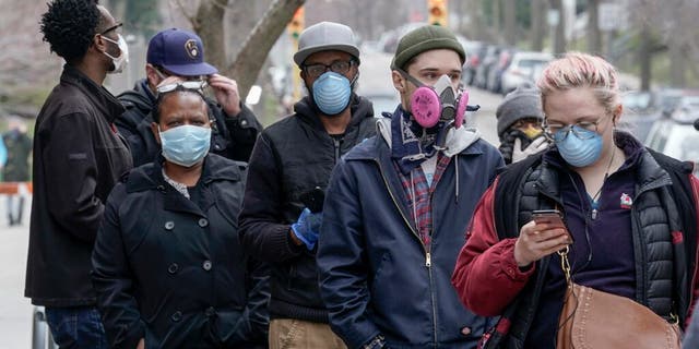 Voters masked against coronavirus line up at Riverside High School for Wisconsin's primary election Tuesday April 7, 2020, in Milwaukee. The new coronavirus causes mild or moderate symptoms for most people, but for some, especially older adults and people with existing health problems, it can cause more severe illness or death. (AP Photo/Morry Gash)