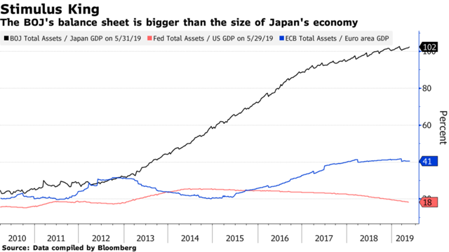 Japan (despite having substantially tapered its QE) continues to print nearly 4% of its monetary base per year after quadrupling that base since early 2013. In 2018, the BOJ bought approximately 67% of JGB issuance, and in 2019, it anticipates buying 70%! In fact, the BOJ's balance sheet is now larger than the entire Japanese economy: