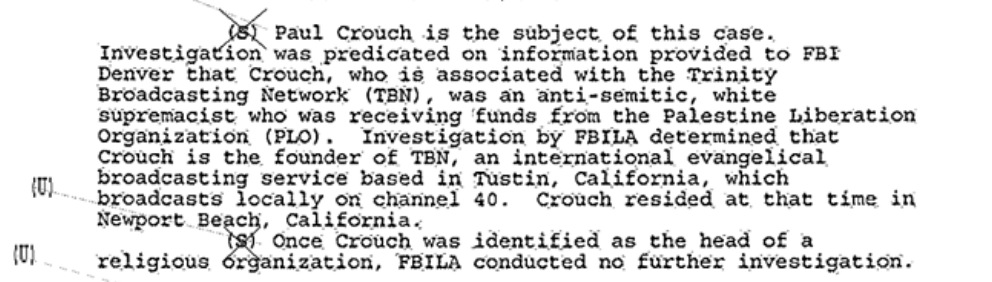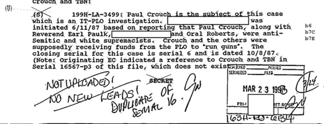 The FBI file also states that "Paul Crouch, along with Reverend Earl Paulk, [redacted] and Oral Roberts were anti-Semitic and white supremacists. Crouch and the others were supposedly receiving funds from the PLO to 'run guns.'"