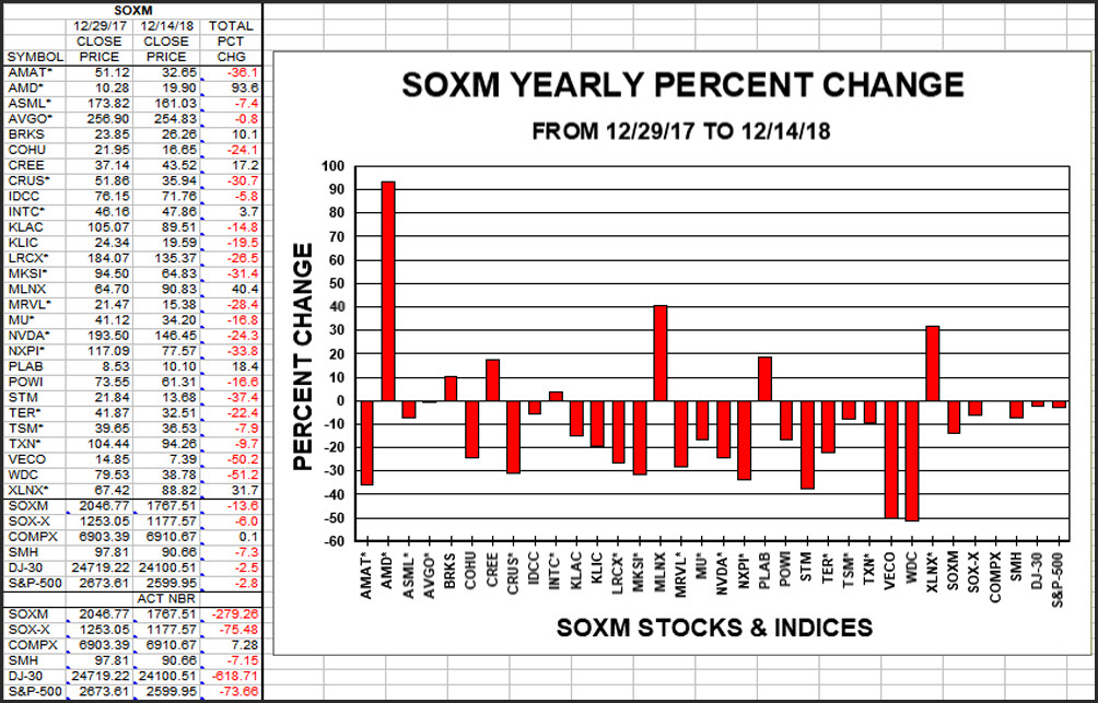 This is the weekly update of the performance of the SOXM stocks and major indices since the 1st of the year to Friday's close in terms of actual and percent change in table and chart formats.