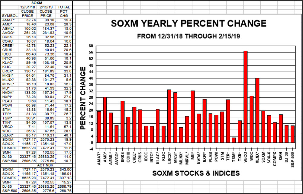 This is the weekly update of the performance of the SOXM stocks and major indices since the 1st of the year to Friday's closing prices in actual and percent terms in table and chart formats.