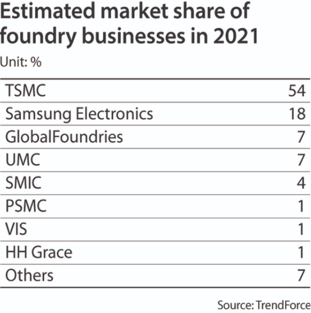TrendForce indicates estimated market share of foundry businesses in 2021: