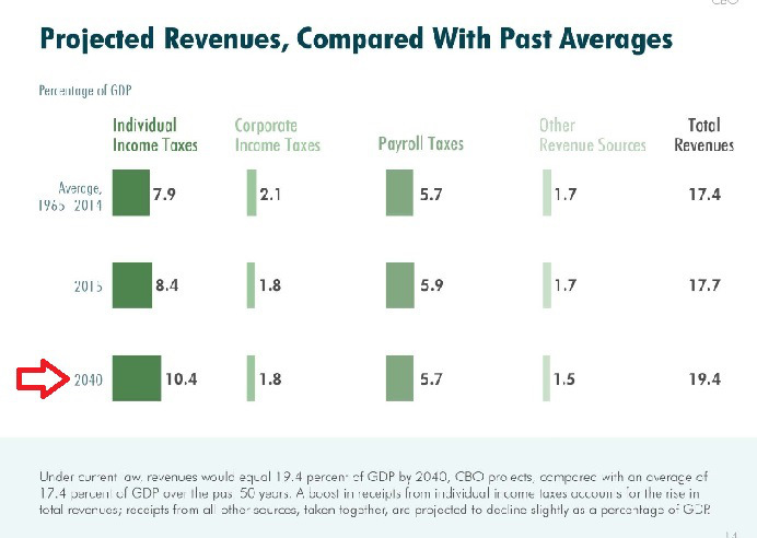 Indeed, tax revenues are projected to rise significantly over the next 25 years. Federal revenues would also increase relative to GDP under current law… Revenues would equal 19.4 percent of GDP by 2040, CBO projects, which would be higher than the 50-year average of 17.4 percent. Here’s another slide from the CBO. I’ve added a red arrow to show that the increase in taxation is due to a climbing income tax burden.