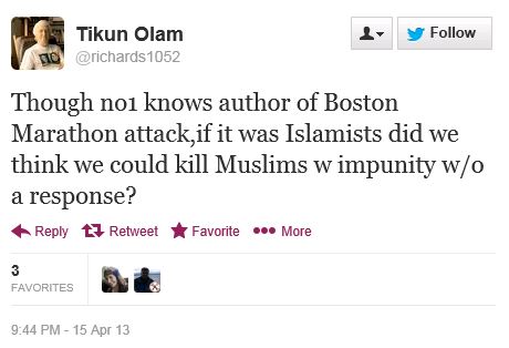 It wasn’t so much an argument based on facts as a hope based on politics, most clearly by David Sirota at Salon.com, but he was far from alone, Add Boston Marathon Bombing to pile of Failed Eliminationist Narratives.