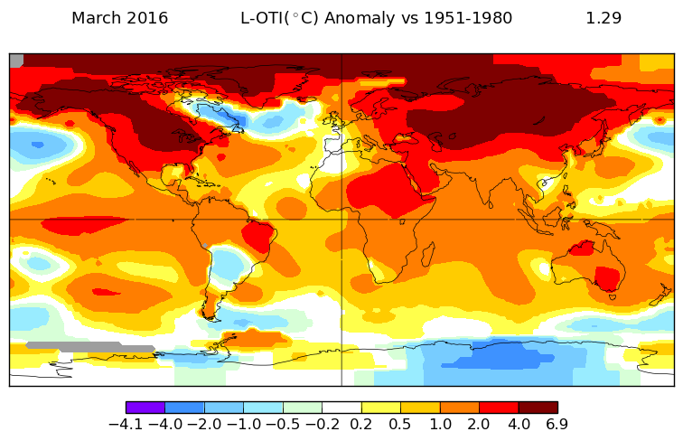 GISS in March is out. The global average anomaly was 1.28°C; down 0.06°C from Feb, but by a long way the warmest March in the record ( Sou has details, note the YTD map). The result is very close to TempLS mesh, which now shows a 0.04°C drop. TempLS rose quite a lot since announced; commenter Olof thinks that Sudan data pushed it up. The NCEP/NCAR index also dropped by 0.057°C. TempLS grid is now down by only 0.014°C, which suggests that NOAA's March figure may be very close to Feb.