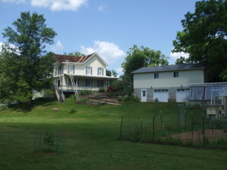 Greenhouse, just visible at far right, has proven to be a good infrastructure investment. Its gives early starts to a number of key garden plantings, and has increased our level of food self sufficiency, though it took a couple of years to get the hang of.