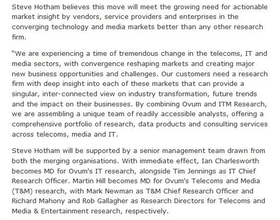 Informa plc announced yesterday that it’s merging Ovum and the Informa Telecoms & Media research business (ITM) to create a new IT, telecoms and media analyst firm. Steve Hotham, currently MD of Ovum, has been appointed as CEO of the new company.  He was kind enough to talk me through what’s happening.