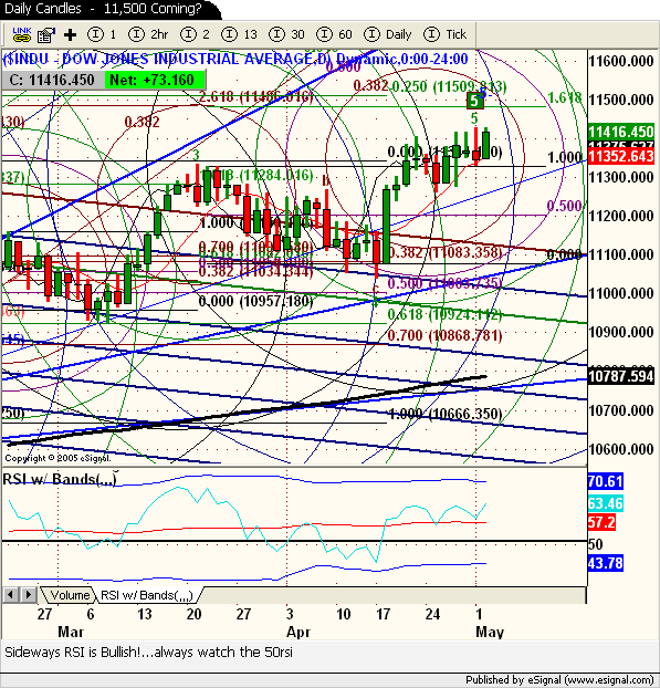 The RSI is moving sideways above 50....the trend should continue. We're going higher even with high commodities,falling dollar and rising rates....can you say hard landing is a coming someday? I guess the FED is still afraid of sustained 5% GDP?