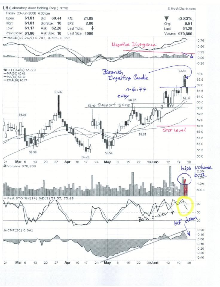 So why doesn’t it make sense to look at the daily chart, and at least on seeing the formation of dark cloud cover or a bearish engulfing candle tighten up the stop until the pattern resolves its self? Sure, one is willing to take the risk outlined in the original stop, but in the face of the weight of the evidence, why take most if not all of that ride down to |
