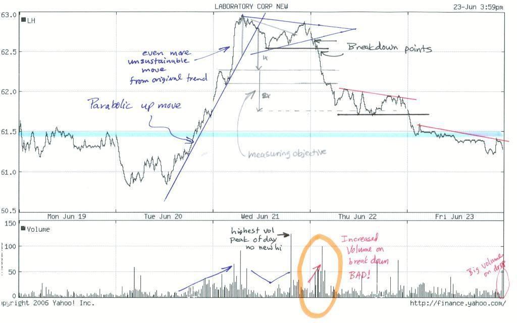 But drilling down one more level to the intraday, the morphology of the false breakout becomes even more apparent. I actually saw this real-time on the hourly charts. The ST trend upward move that triggered the trade was a near parabolic move. In its favor was the increasing volume to support the move. The problem came when that move went vertical on the second day, and unsustainable move. So a pull back was in the cards. Now the problem comes when later in the day the price rallies on the highest single period volume but the price fails to make a new high. More signs of correction. But the clincher comes when the topping pennant is violated to the down side, and the support level from the previous day’s intraday low is also violated ON INCREASED VOLUME. Then later in that same day we see a few volume spikes that are unable to drive the price above a previous peak and thus forms a descending right pennant.