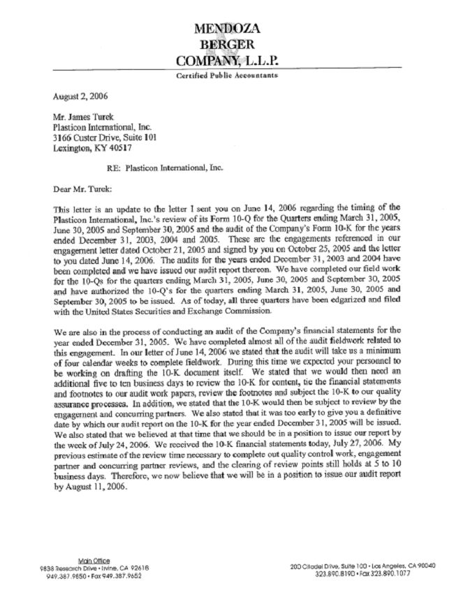 This letter is an update to the letter I sent you on June 14, 2006 regarding the timing of the Plasticon International, Inc.’s review of its Form 10-Q for the Quarters ending March 31, 2005, June 30, 2005, and September 30, 2005. These are the engagements referenced in our engagement letter dated October 21, 2005 and signed by you on October 25, 2005 and the letter to you dated June 14, 2006.