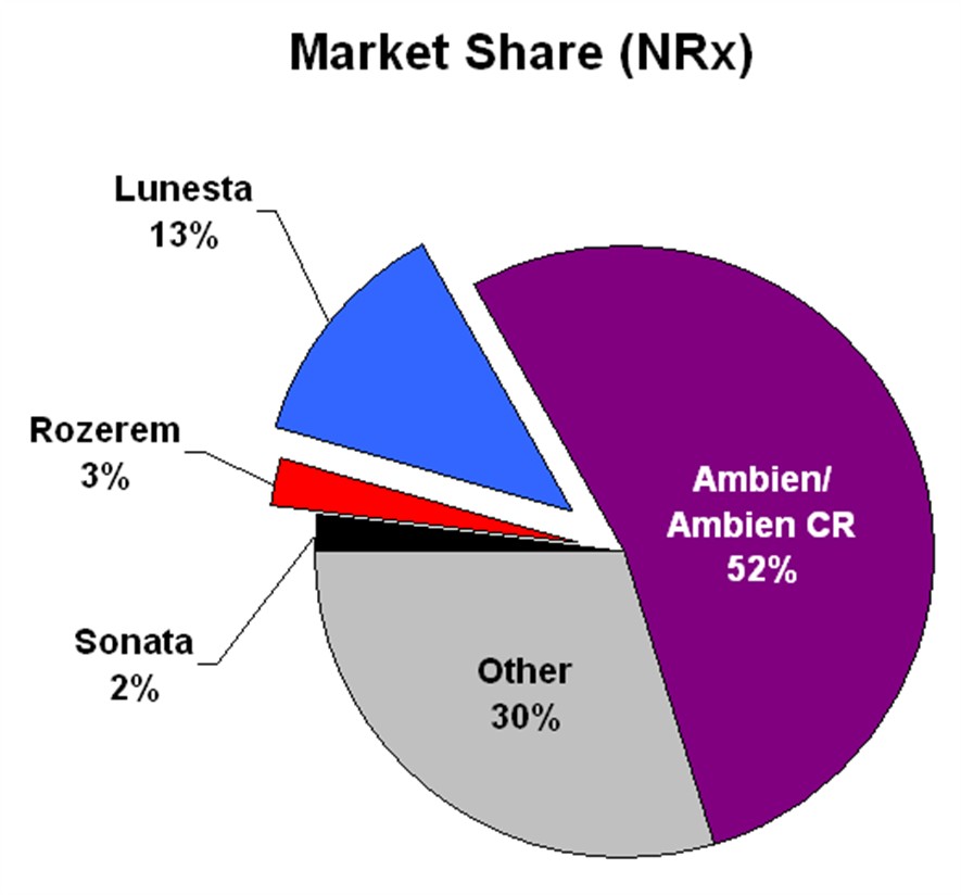 The Numbers Don't Add Up BTW, I got these market share numbers from BrandWeek, which appears to have gotten them from Merrill Lynch who got them form... I dunno! If we add up the Ambien and Lunesta market share numbers, we get 66%, which leaves 34% to Rozerem and Sonata, the other drugs in the insomnia category. Sonata must be a minor player, so the bulk of that 34% must represent Rozerem's market share according to these numbers.