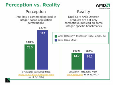 betanews.com But one of the slides from a presentation Berlind gave during the conference cited official SPECint_rate2006 results dated last January 29, showing the best peak performance of systems tested for the Standard Performance Evaluation Corporation using comparable dual-core Opteron and Xeon processors. In that slide - which AMD also provided to BetaNews last February 7 - an AMD Opteron 2220 SE-based server outperformed an Intel Xeon 5160-based system by a narrow margin of three percentage points, in a test in whose category Intel had earlier claimed superiority. Intel's numbers, cited by AMD, show SPECint_rate2000 results for systems with the same two processors, in which the Xeon system performed 57% better than the Opteron system. AMD has pointed out Intel's numbers come from an outdated benchmark.