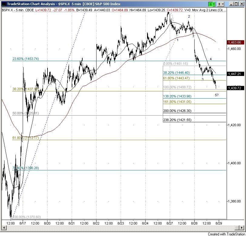 1438 on the SP cash is 38.2% decline of the advance from 1370 to 1480. Also, within the decline from 1480, wave v = i at 1438.