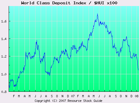 Even the “blue chip” exploration and development companies, which have been combined by Resource Stock Guide into a World Class Deposit Index, are not performing up to par. Stocks included in this index have the largest undeveloped gold, silver and uranium deposits in the world. They are prime targets for acquisition by major companies, yet they have underperformed the $HUI index by a wide margin since last summer.