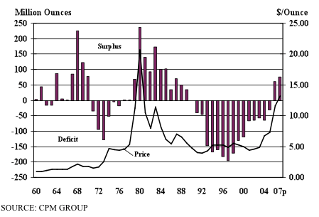 In the graph below, surpluses represent investors buying more silver and deficits represent investors selling silver into the market on a net basis. Surpluses usually correlate to rising prices when they first emerge and are expanding. Later, when surpluses persist but begin to decline, prices begin to fall. As you can see in the chart below, the deficits that occurred throughout the 1990’s were close to 5 times larger than they were in the inflationary period of the 1970’s. The characteristics and similarities between these time periods, leads me to believe that the current run in silver in should surpass the 1980 highs of $48 an ounce.