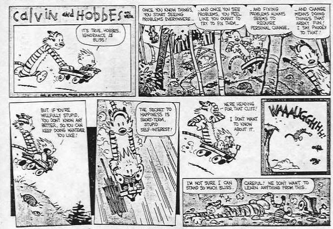 Recently on a very unrelated (and non-financial) forum, the discussion was the best cartoons of all time. The general consensus leaned toward Larson for single frames, and (with lesser plurality) to Bill Watterson (Calvin and Hobbes) for the best strips. I posted this link to what I consider (by far, IMO) the best comic strip ever written. Thought I'd re-post it here while the link is handy. The concept of "willfully stupid" (or, if you wish to be more intellectually correct, "willfully ignorant") is a powerful explanation of much of what ails modern society. If this doesn't ring a bell for you, hey, great, no biggie. If it "hooks" you just a bit, then re-read it again and again, it will come to you. If it just KOs you at the outset (like it did me), well, then, just re-read it again and again, and enjoy the clubbing. Genius. Without further ado ...