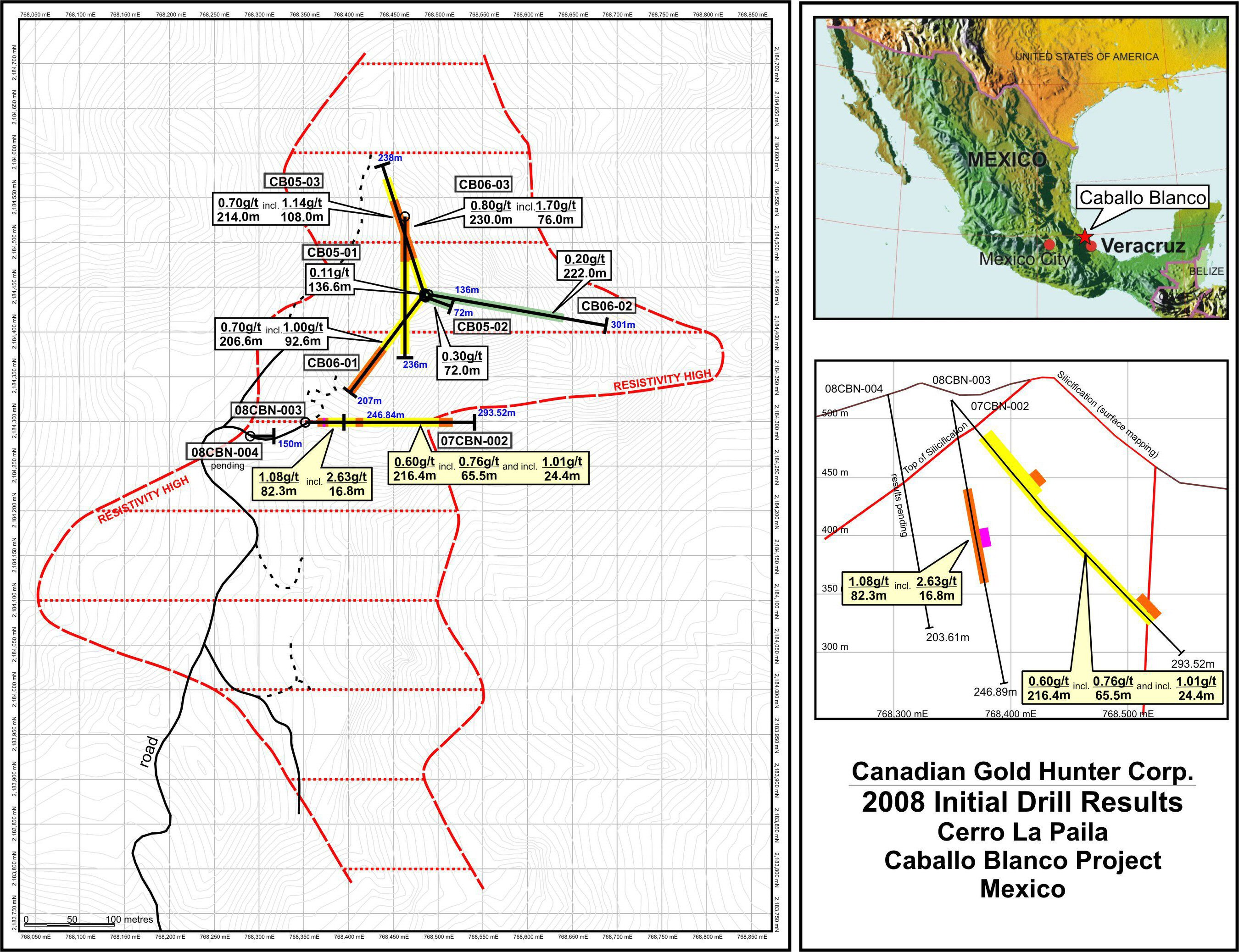 VANCOUVER, BRITISH COLUMBIA--(Marketwire - April 10, 2008) - Canadian Gold Hunter Corp. (the "Company") (TSX: CGH.TO) is pleased to report the remaining assay results from core hole 07CBN-002 and all of 08CBN-003 from the Caballo Blanco project in Veracruz, Mexico. Core hole 07CBN-003 intersected 1.08 g/t gold over 82.30 metres in an iron-oxide-cemented silica breccia. The hole was lost in a fault zone in vuggy silica breccia at 246.9 metres