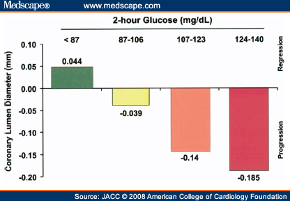 Post-Challenge Glucose and Coronary Atherosclerosis Progression. Patients with normal glucose tolerance who had a post-prandial glucose level of <87 mg/dl had coronary regression. The remaining patients had coronary progression in proportion to the increase in post-prandial glucose. Data from Mellen et al. [10].         |