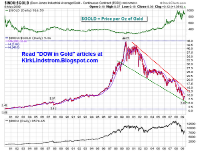 "The Dow Jones Industrial Average measured in how many ounces of gold it takes to buy the 30 stock DOW is up 33% from its 17-year March 6th low of 7.03. Despite that impressive gain, the DOW-Gold ratio remains 79% below its 1999 peak of 44.77."
