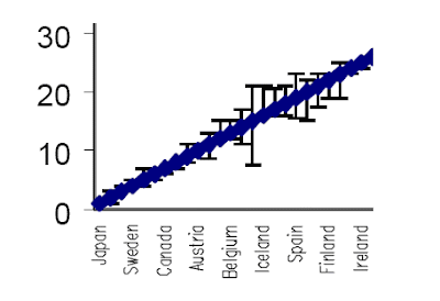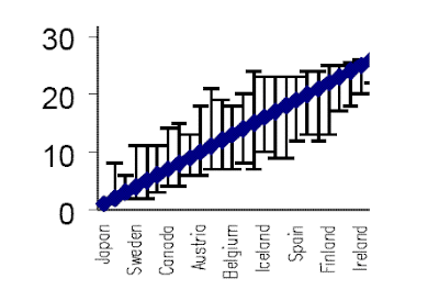 The U.S. is not named specifically on the horizontal axis, but it is the country just to the left of Iceland. Notably, its interval is a good bit wider than those around it. Obviously, there is considerable overlap among these intervals, and we cannot say with great confidence that the U.S. doesn't rank better than both France and Canada.
