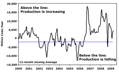 Production growth has been a disaster for natural gas prices. But here's some small comfort for natty bulls: Shale wells produce most of their gas in the first 12 to 18 months and then taper off sharply. The wells that were tapped in late 2006 should be "running out of steam" any day now. And few new ones are coming to take their place...