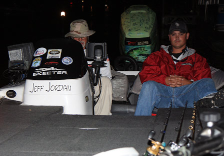 "Pro Jeff Jordan adjusts a stock trade from his phone prior to the Day One launch. His co-angler for the day is Cody Reed."