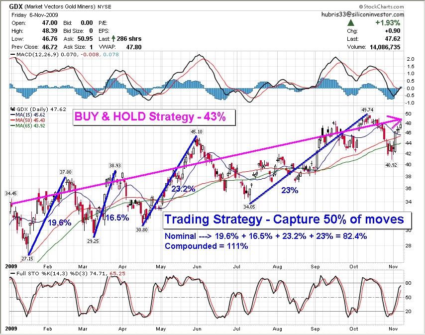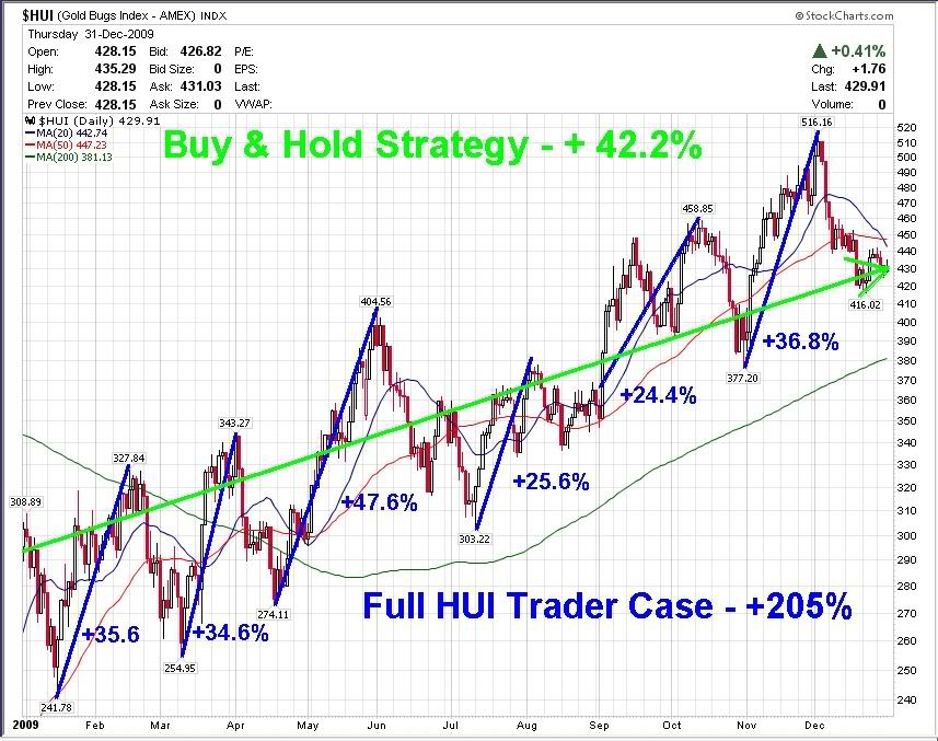 Now assume one wanted to trade the moves in the HUI and use that as a benchmark. If one was extremely lucky and bought in at the exact low of ever move and sold at the exact high of every move, as shown on the chart, the return for the year would be 205%. Let’s call this the “Full HUI Case.”
