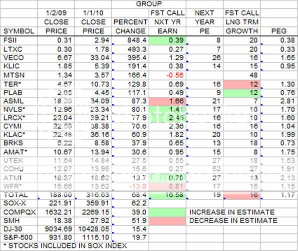 This is a table that shows the yearly performance of the Group sorted by percent change. All stocks were up for the year with the exception of WFR which was down 13 percent. Only MTSN has negative earnings projected for Next Yr. Bottom line numbers are PE 19, long term growth 16, and PEG 1.17 going into 2010.