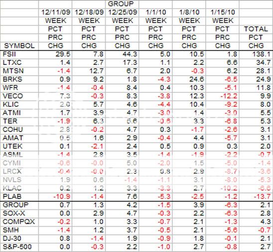 This is a longer 6 week look at the Group performance. Bottom line numbers for the most part are positive except for SMH which is slightly negative. Both FSII and LTXC have positive numbers for all 6 weeks. PLAB, the high flyer of the Group many months ago is now in the doghouse, down 5 of the last 6 weeks.
